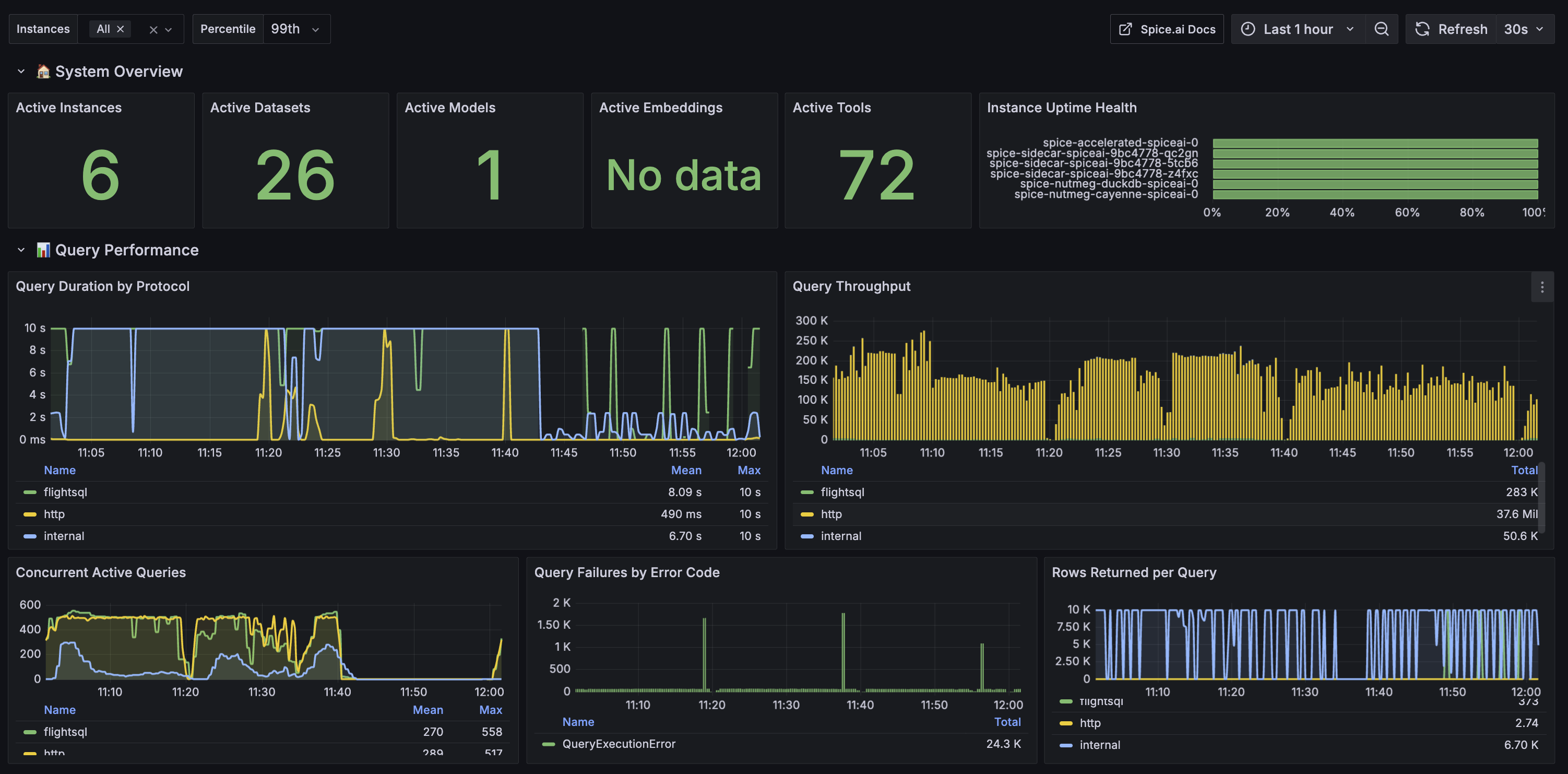 Spice can be monitored with Grafana using the Spice Metrics Endpoint and pre-built dashboards available in the Spice repository.