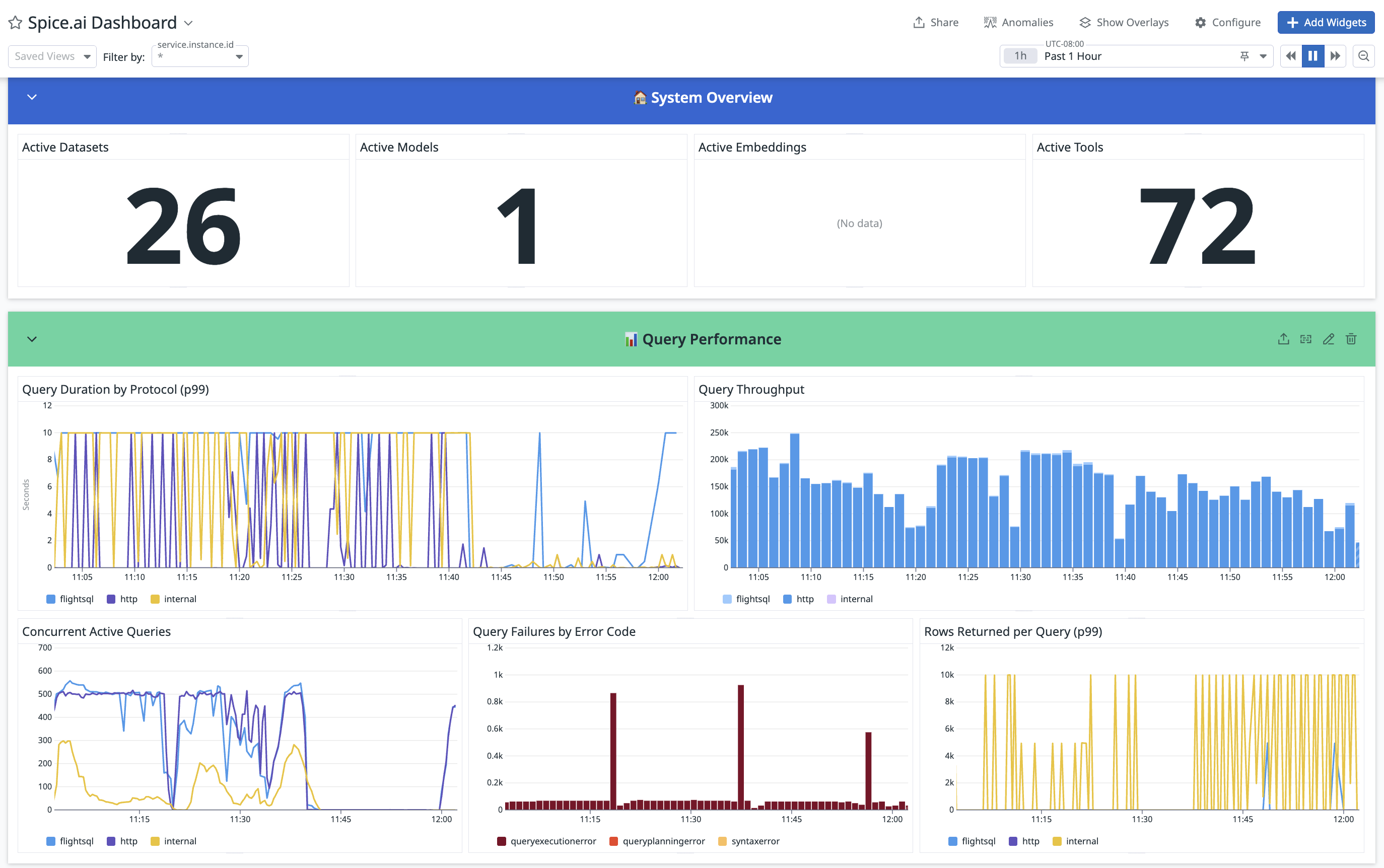 - Dashbord is now configured to display Spice.ai OSS key performance metrics
